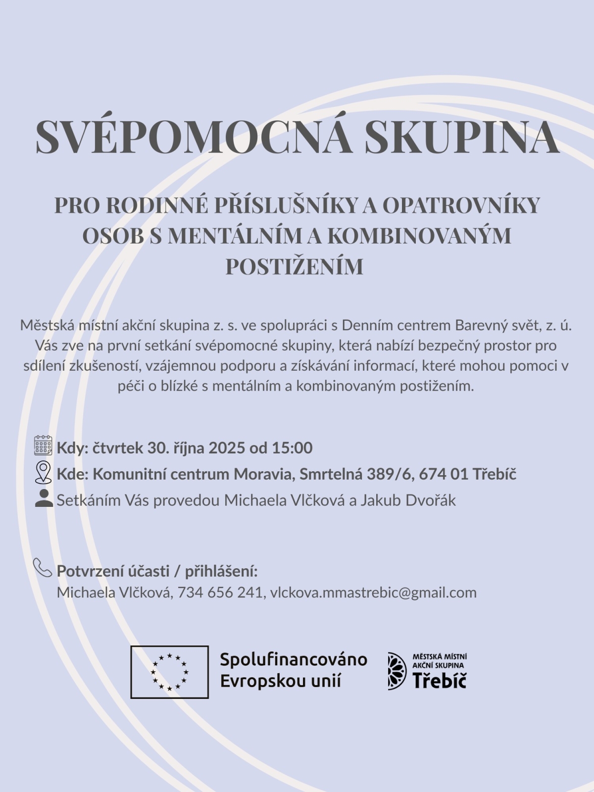 Zveme Vás na setkání svépomocné skupiny pro rodinné příslušníky a opatrovníky osob s mentálním a kombinovaným postižením, které se bude konat v Komunitním centru Moravia.