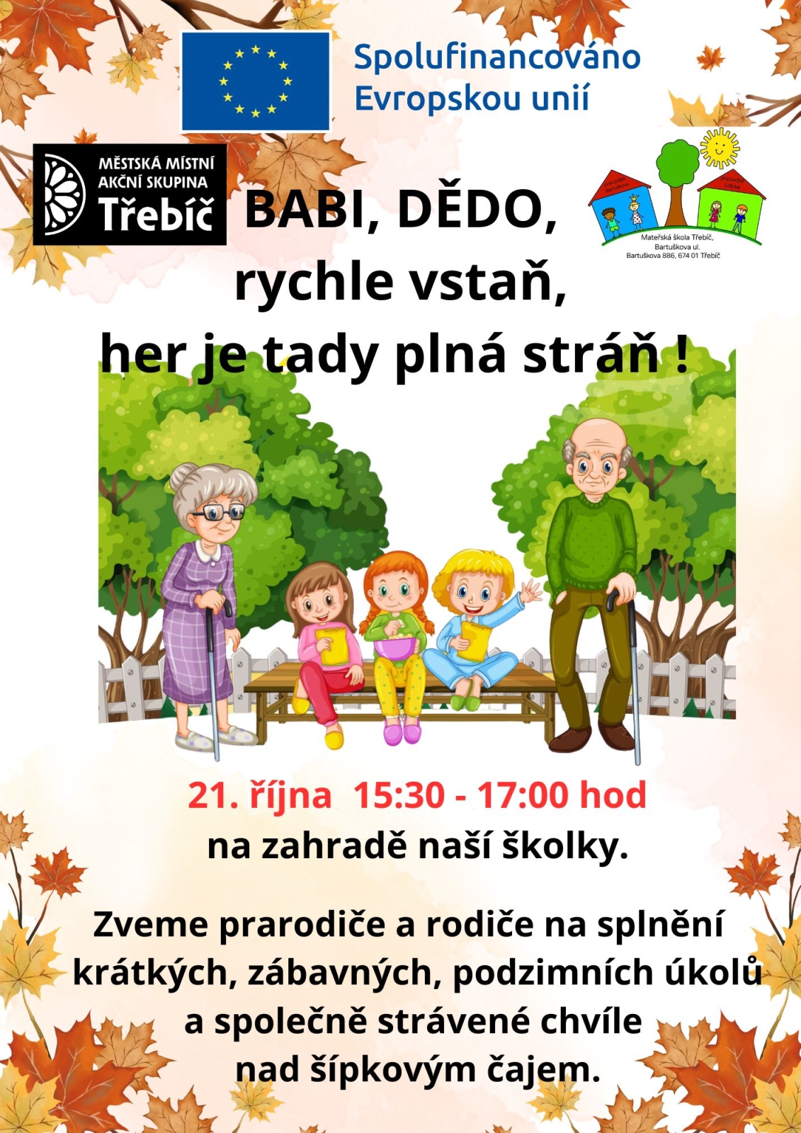 Zveme prarodiče a rodiče na plnění krátkých a zábavných podzimních úkolů a příjemně strávené odpoledne nad šípkovým čajem. Těšíme se na setkání v zahradě školky MŠ Bartuškova.